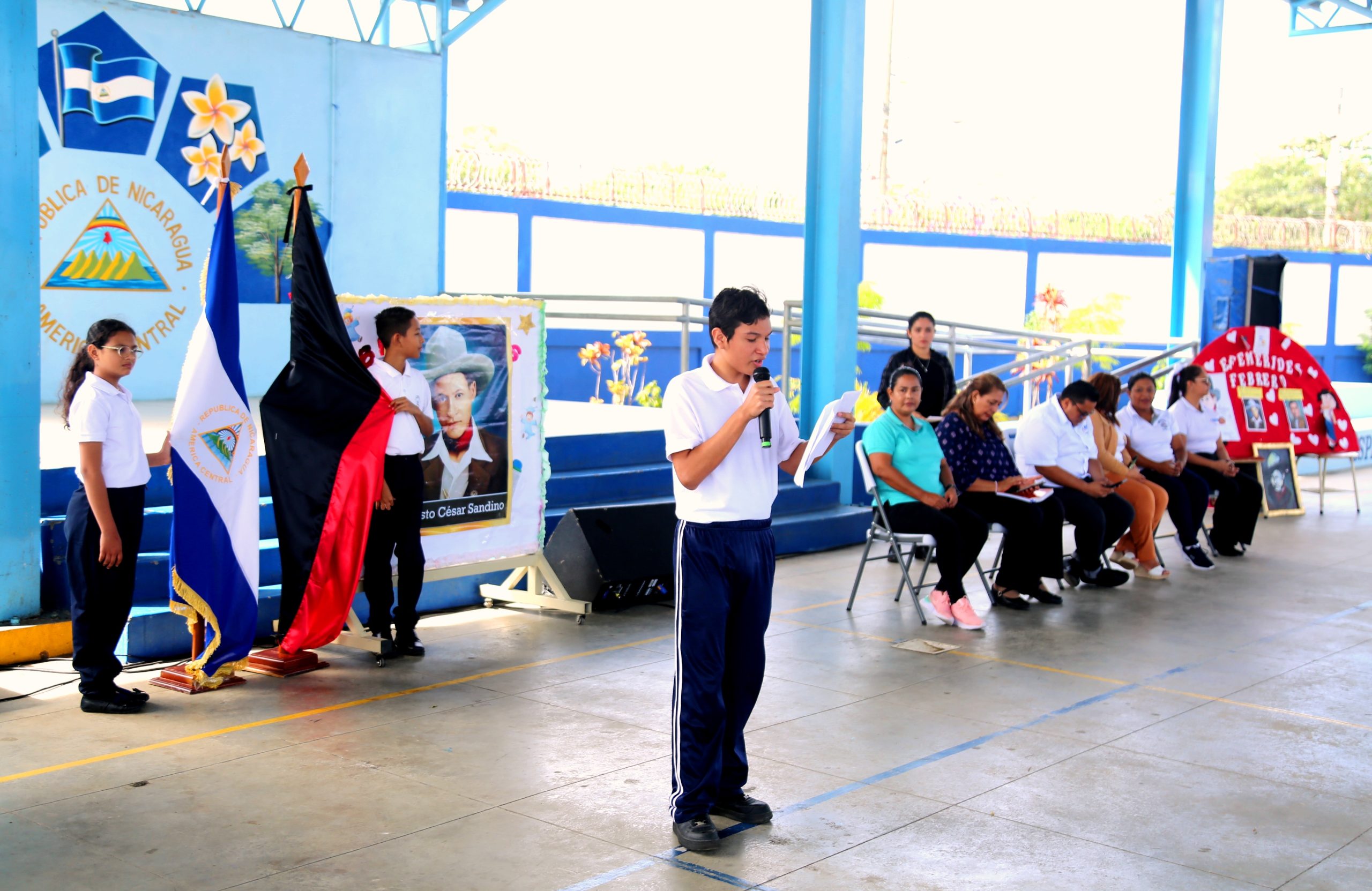 En el Colegio Augusto C. Sandino, ubicado en el Distrito IV de Managua, los participantes declamaron poesías, realizaron presentaciones de bailes folklóricos y compartieron la biografía del héroe, llenos de alegría y orgullo.