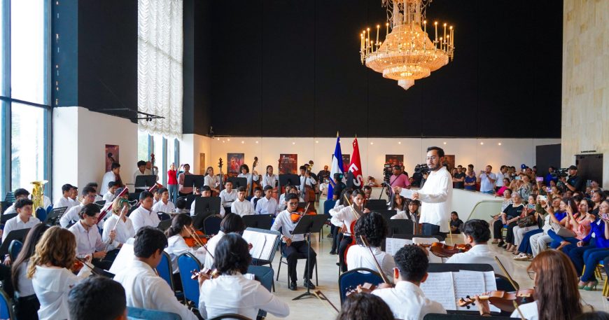 Esta tarde se realizó el Encuentro Regional de Orquestas Sinfónicas Estudiantiles desde el Salón de los Cristales del Teatro Nacional Rubén Darío, donde se vivió una inolvidable jornada cultural que reunió a 185 estudiantes en el escenario.