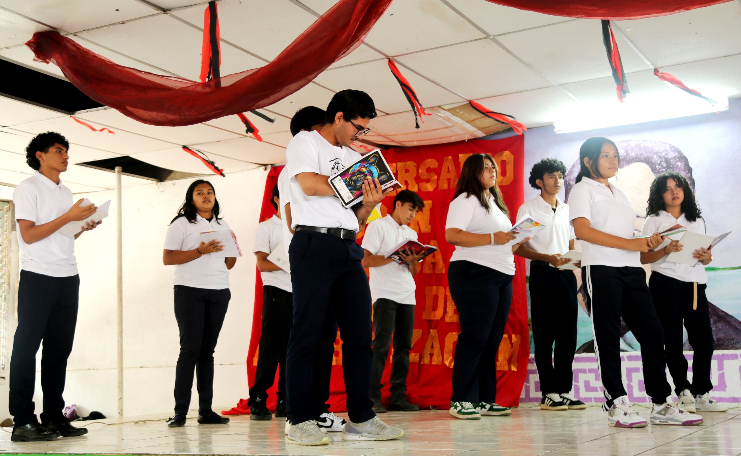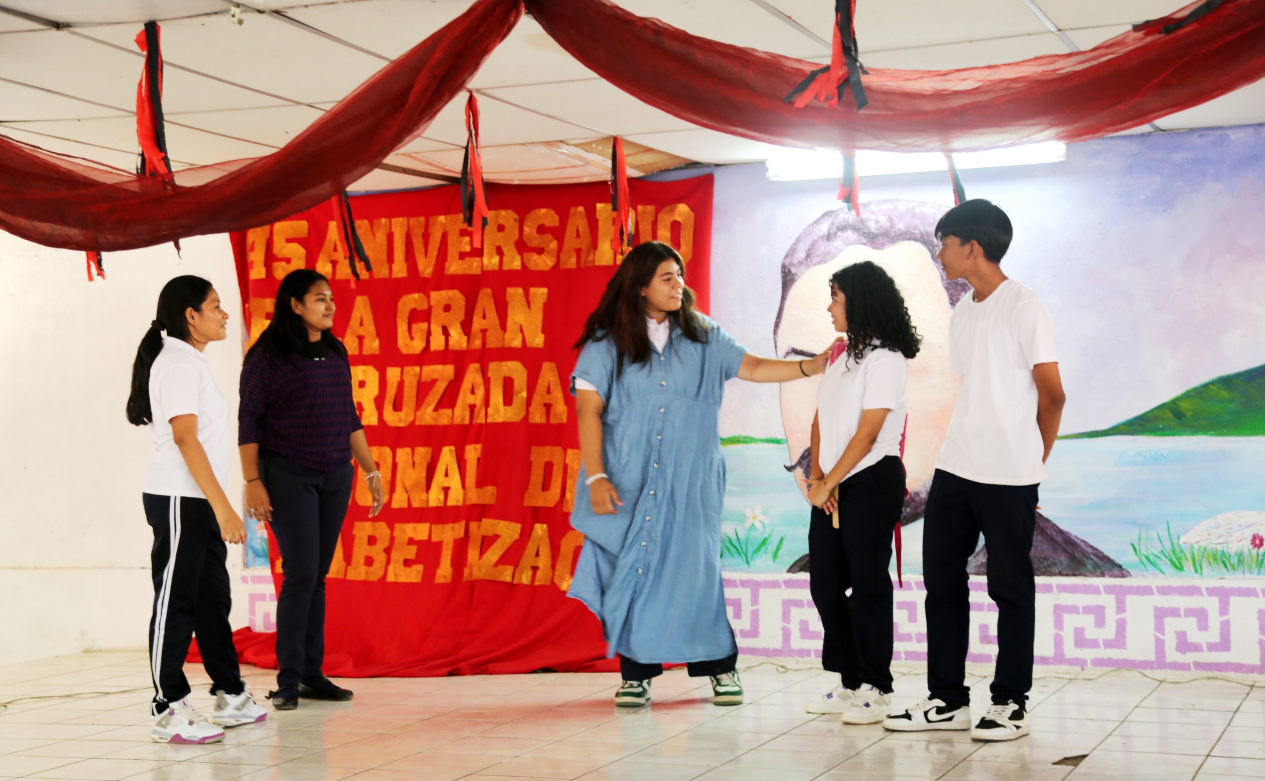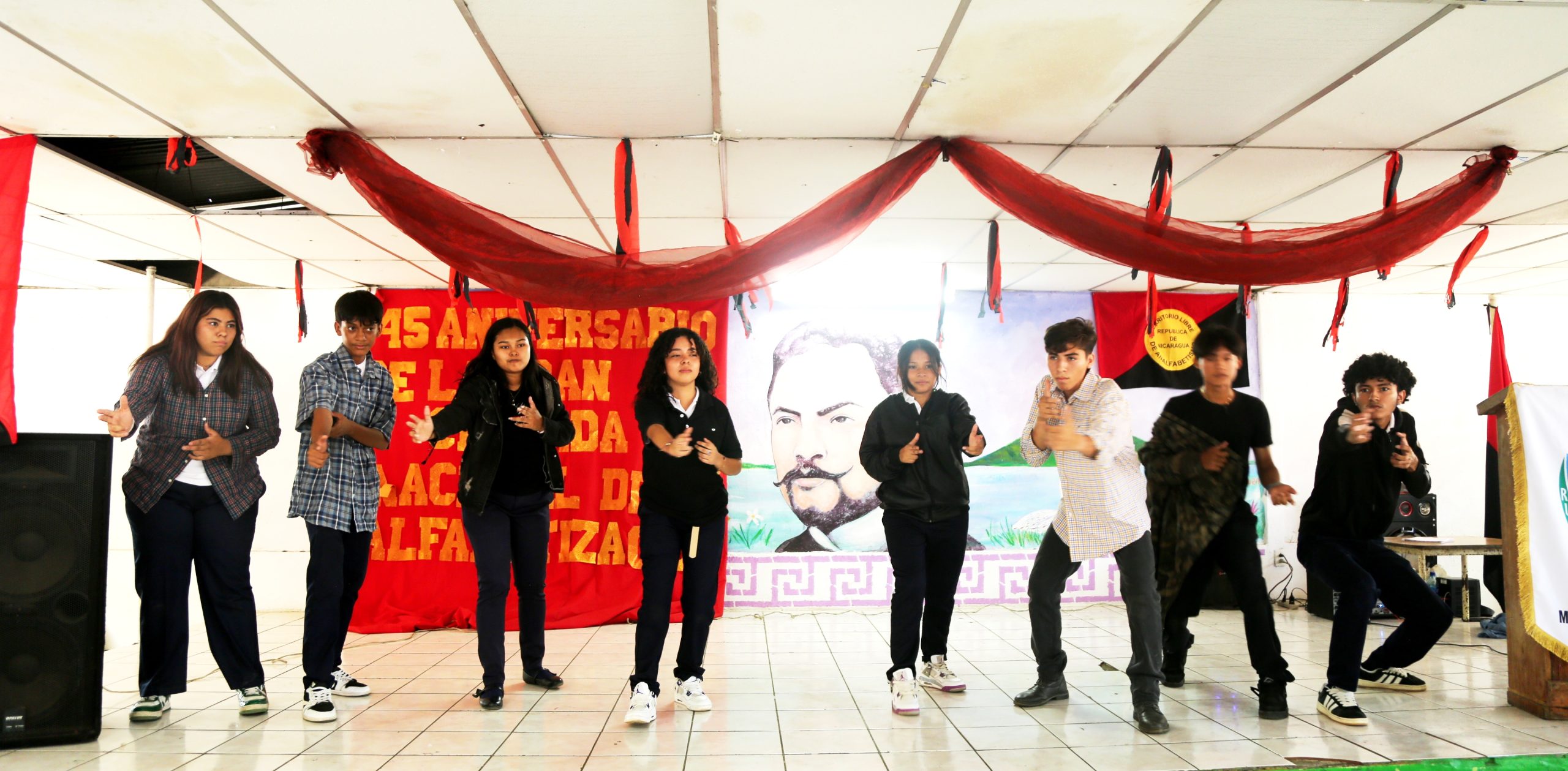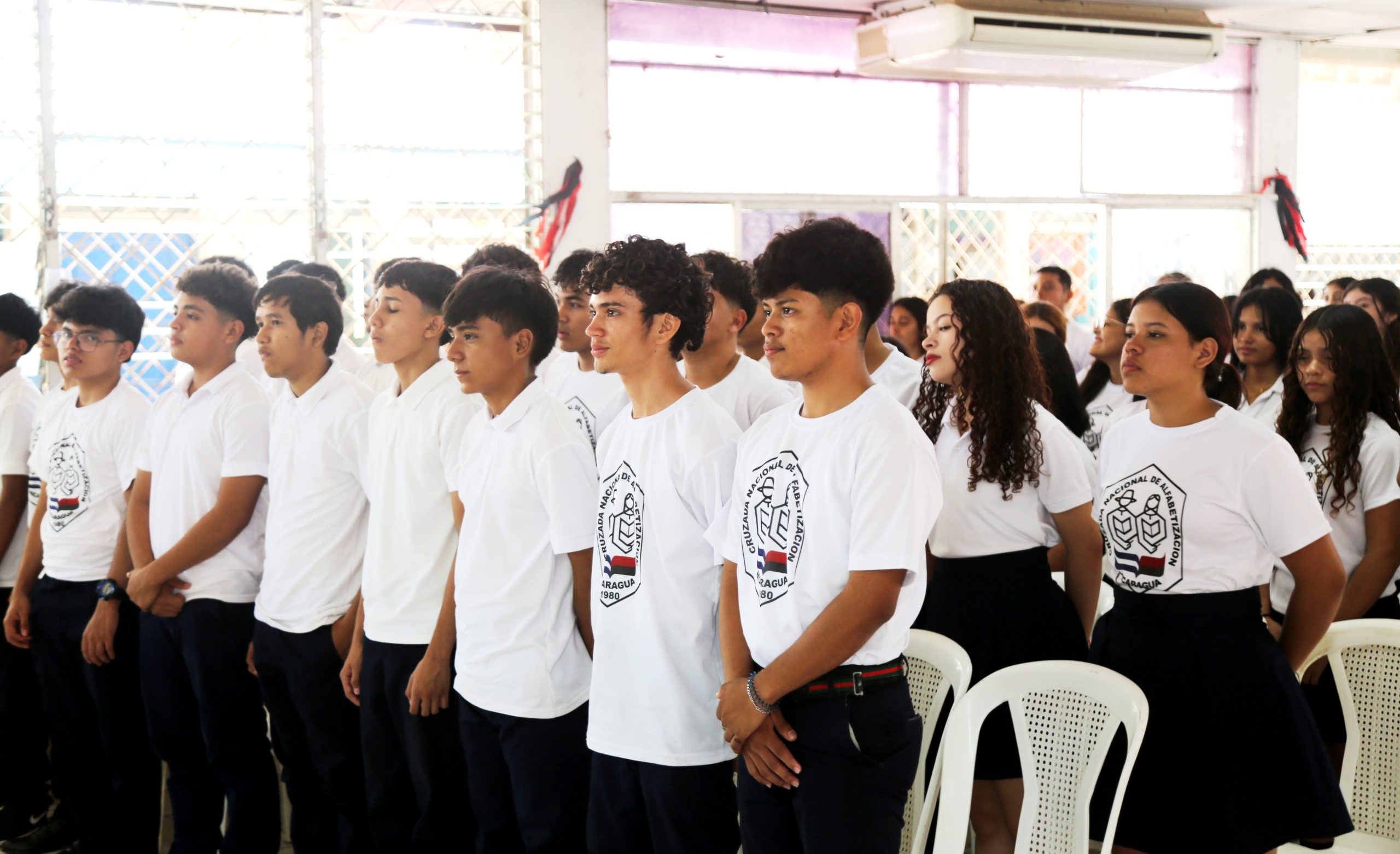 Con una obra de teatro, bajo el lema “Héroes y Mártires por la Liberación de Nicaragua”, estudiantes y maestros de Secundaria, del Colegio Rubén Darío, del DIV de la capital, conmemoraron el 45 Aniversario del Inicio de la Cruzada Nacional de Alfabetización (CNA), epopeya de 1980, en la que miles de jóvenes nicaragüenses enseñaron a leer y escribir a campesinos que vivían en el analfabetismo, convirtiendo la oscuridad en luz.