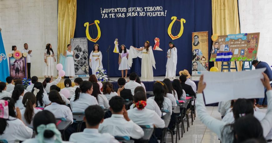 El auditorio de la Escuela Normal de Formación Superior de Managua, Alessio Blandón, se convirtió en escenario de los poemas, obras y música del Príncipe de las Letras Castellanas, Rubén Darío, en conmemoración al 110 aniversario del paso a la inmortalidad.