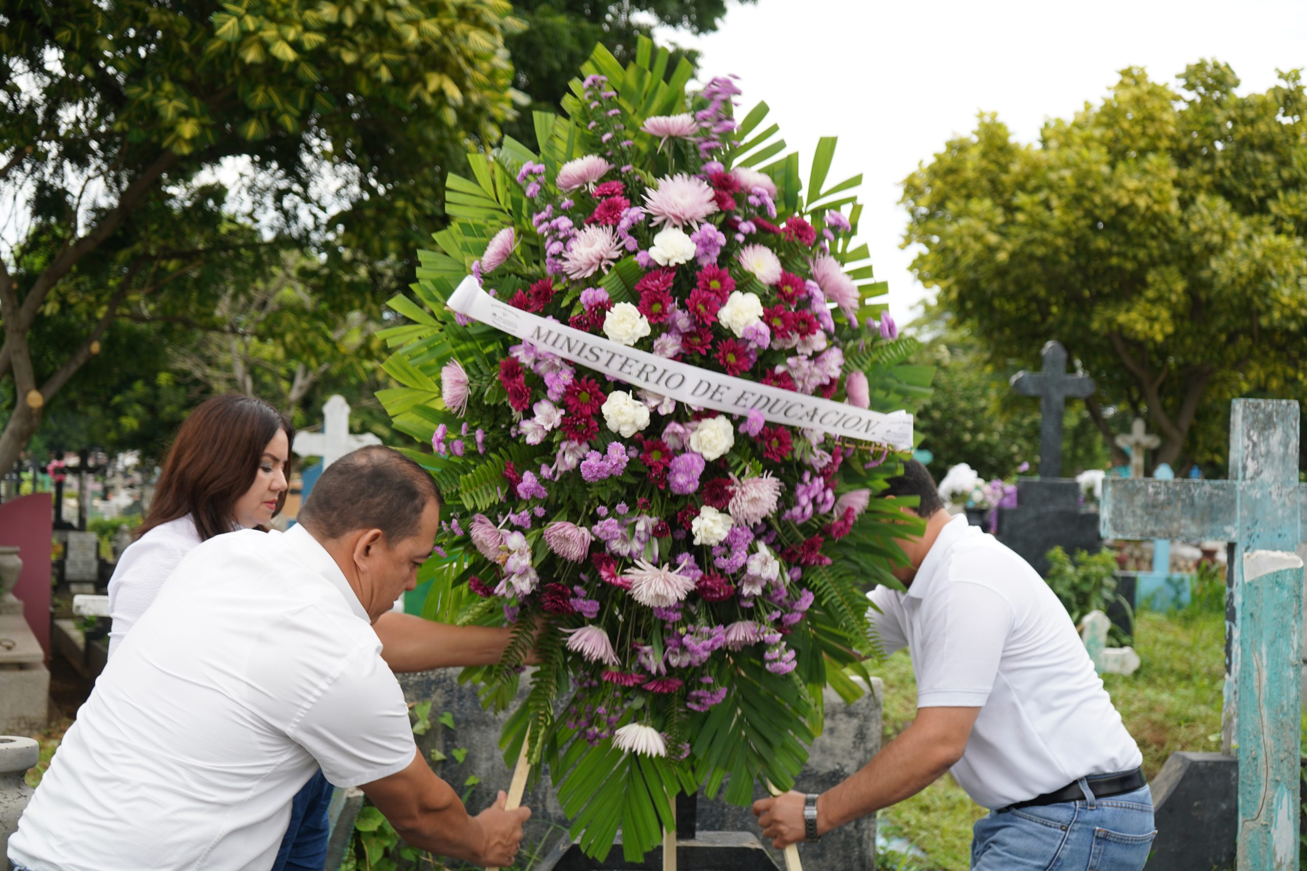 La Ministra de Educación, Mendy Aráuz Silva, junto a servidores públicos, encabezó la colocación de ofrendas florales en los Cementerios Periférico y Sierras de Paz, en Managua, en homenaje a los maestros: Julio César Sandoval, Luis Amaya y sor Emilia Rachela.