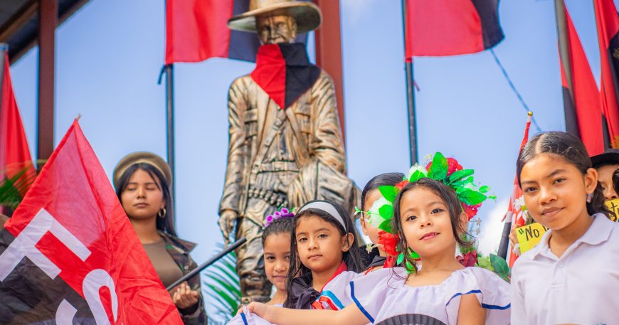 Los pequeños lucieron trajes alusivos al General de Hombres y Mujeres Libres, portaron cuadros con su imagen, llevaron flores silvestres, murales, pañoletas y banderas rojinegras, y corearon la consigna: Sandino vive, la lucha sigue.